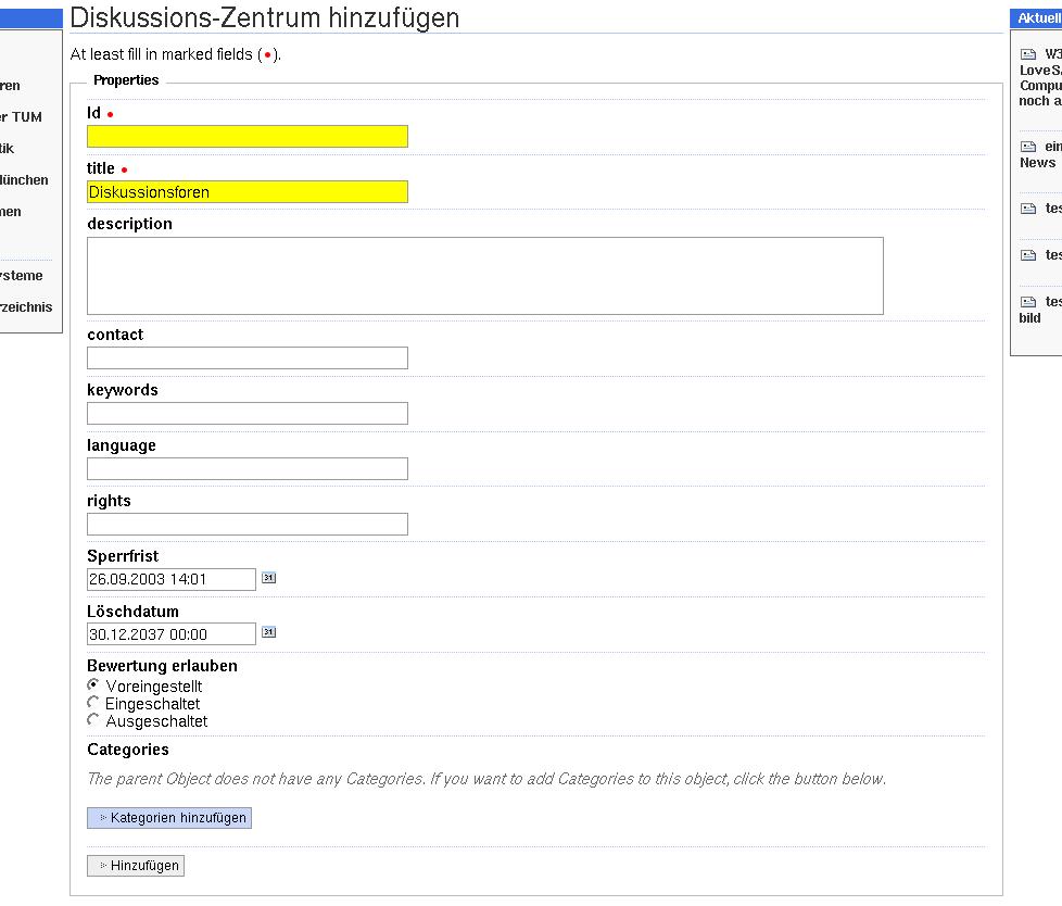 Es können aus allen Kategorien Bereiche ausgewählt werden, müssen aber nicht. Als Defaultwert ist dann immer alles eingetragen bzw. ist nicht notwendig (z.B. bei Discussionboard ist Kategorie tum_veranstaltungstyp nicht relevant, d.h. wird nicht verwendet) - Wenn alles eingetragen ist den hellgrauen Button 'Add Discussioncenter' unten links innerhalb des Formularrahmens anklicken.