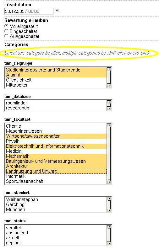 Bei Anklicken erscheint das gleiche Formular, das aber unten (scrollen!) um einige Kategorien erweitert ist. Hier werden Kategorien eingetragen wie Fakultät, Standort, Studiengang, Mitarbeiter usw. Durch Anklicken mit der Maus wird ein Begriff ausgewählt. Bei mehreren untereinander liegenden mit 'shift' arbeiten; bei mehreren einzelnen mit 'Strg'. (Abb. 4)