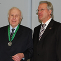 Bayreuths früherer Uni-Präsident Prof. Dr. Helmut Ruppert (r.) verleiht Prof. Dr. Franz Mayinger die Ehrensenator-Würde.