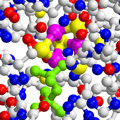 Sitemap > Presse & Kommunikation > Pressemitteilungen > Sonderweg macht Bakterien angreifbar > Neues Ziel für Antibiotika: Der Eisen-Schwefel-Cluster (lila/gelb) im Inneren des IspH-Proteins von Bakterien.